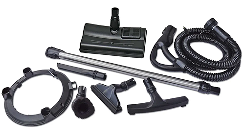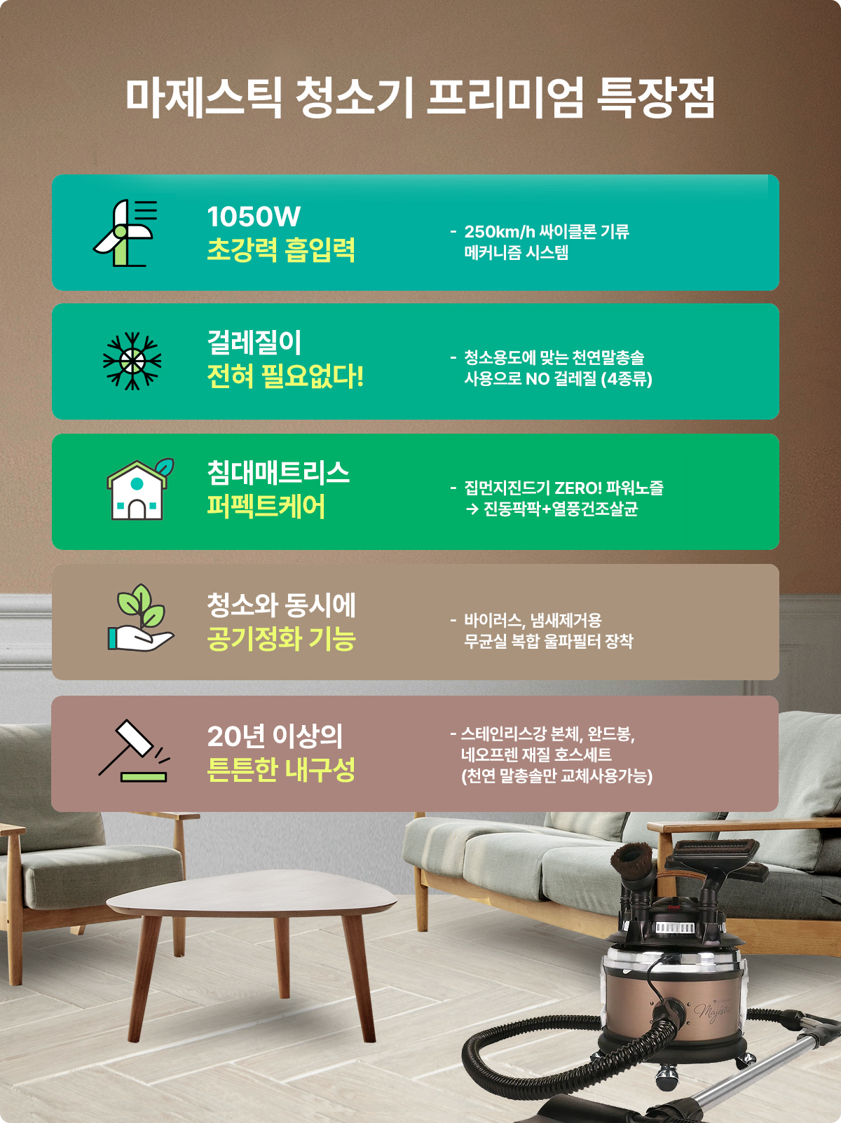 스테인리스강과 ABS수지를 프레스 접합한 완드(봉), 피아노선 10가닥을 내장하여 네오플린 재질로 제작한 호스손잡이세트, 10인치 브러시·6인치 브러시·원형브러시 틈새용노즐을 세팅하여 보관하기 편한 크라운부품꽂이.침대매트리스 전용 파워노즐 브러시